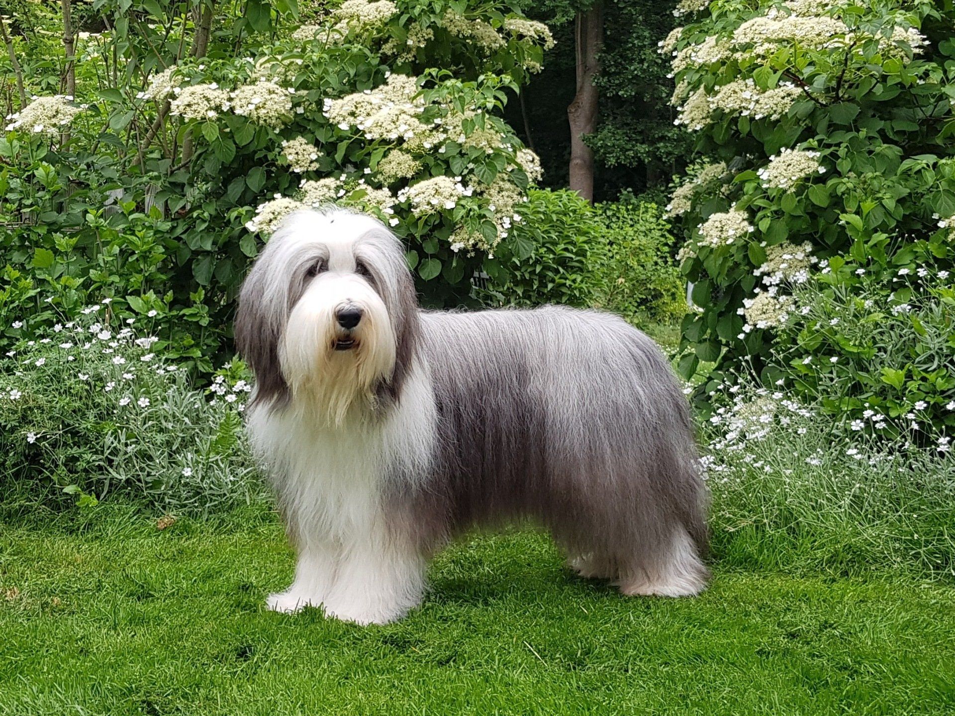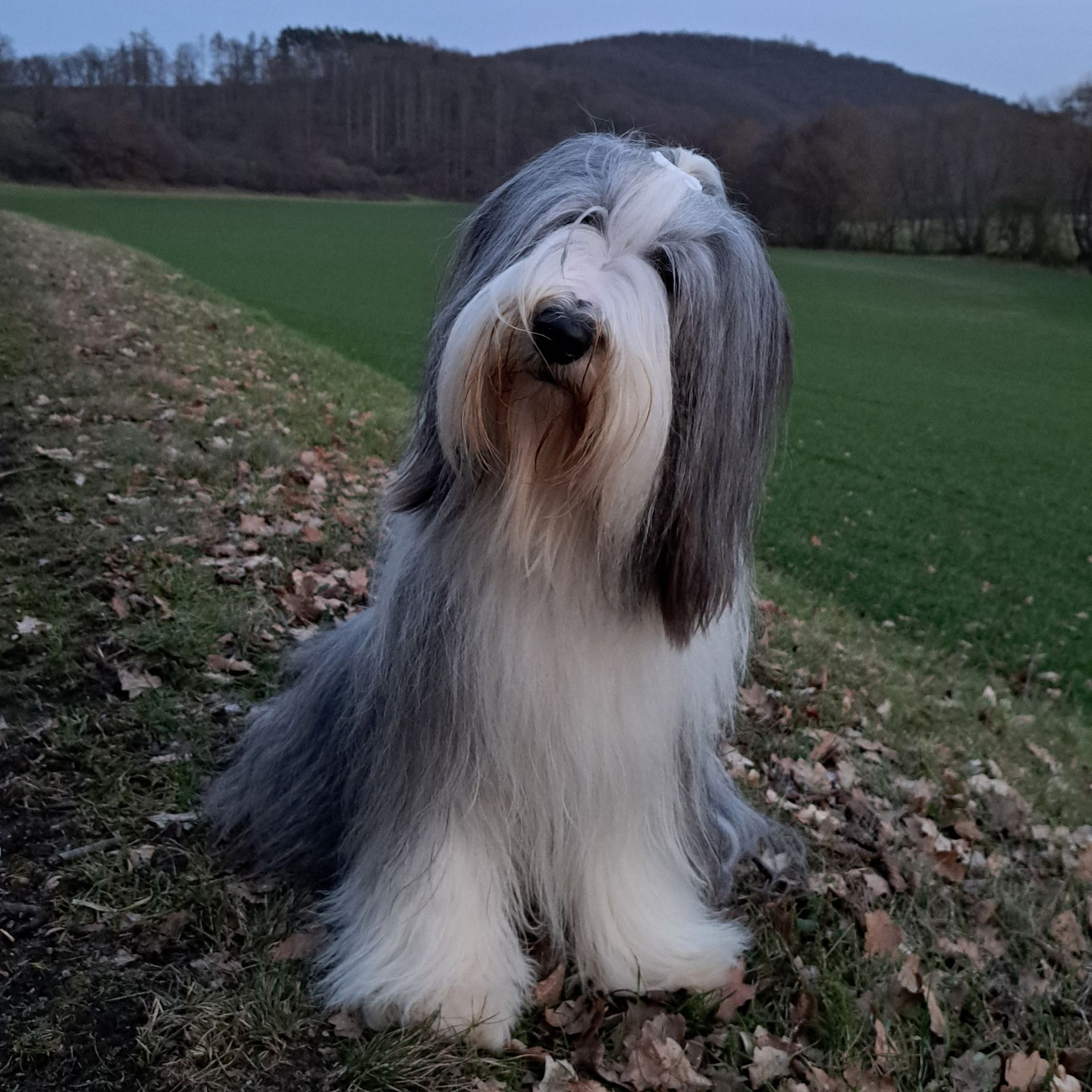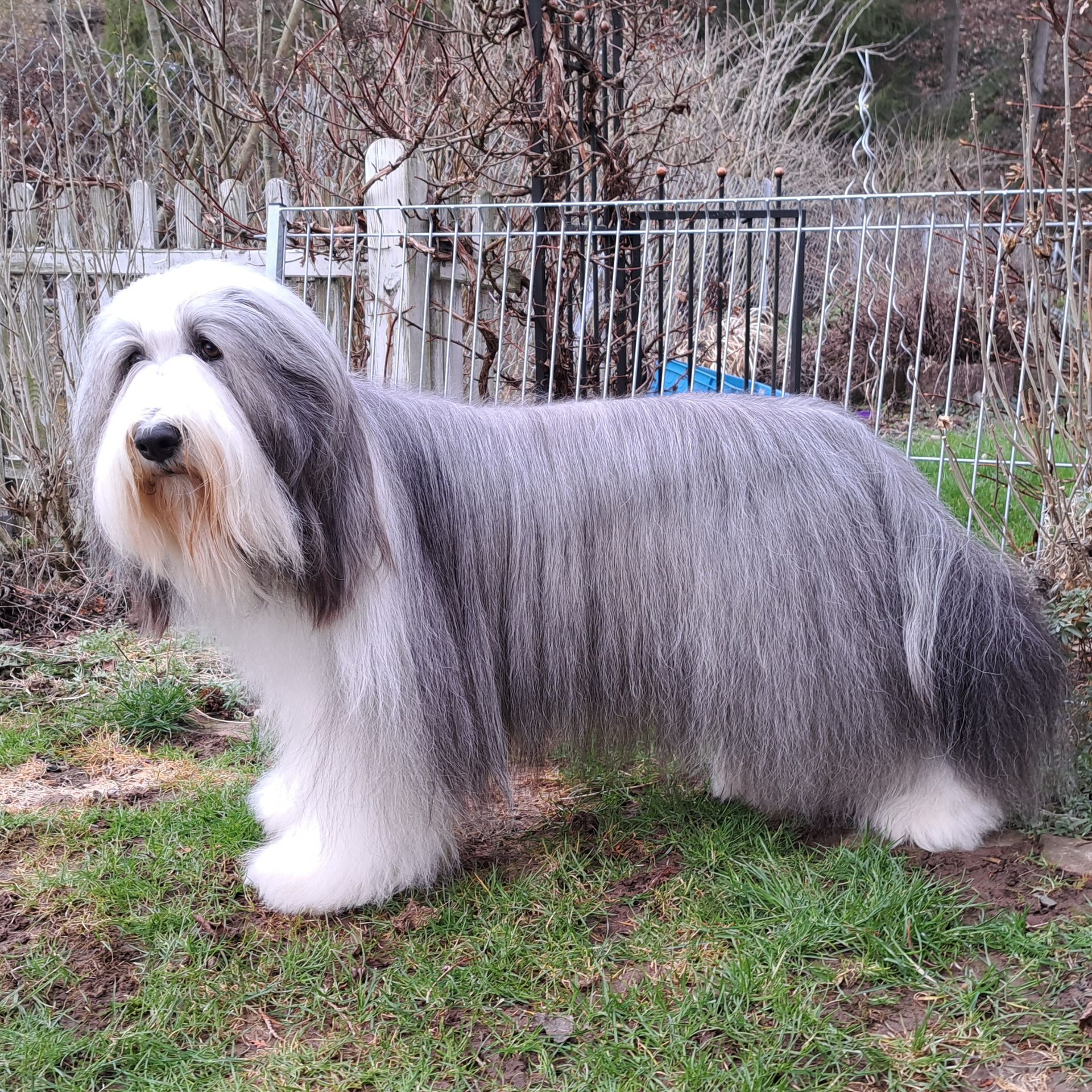2,5 Jahre alte vorzüglich aufgebaute Hündin, feminine Gesamterscheinung und Typ, vorzüglich geschnittener Hündinnenkopf, Augenfarbe braun, sehr gutes Pigment, vorzügliche Halslänge, gerader fester Rücken, vorzügliche obere und untere Linie, vorzügliche Winkelung, tiefer Brustkorb, vorzügliche Vorbrust, tiefgestellte Sprunggelenke, mühelos raumgreifendes Gangwerk, elegant, feundliches und aufmerksames Verhalten, vorzügliche Haarqualität