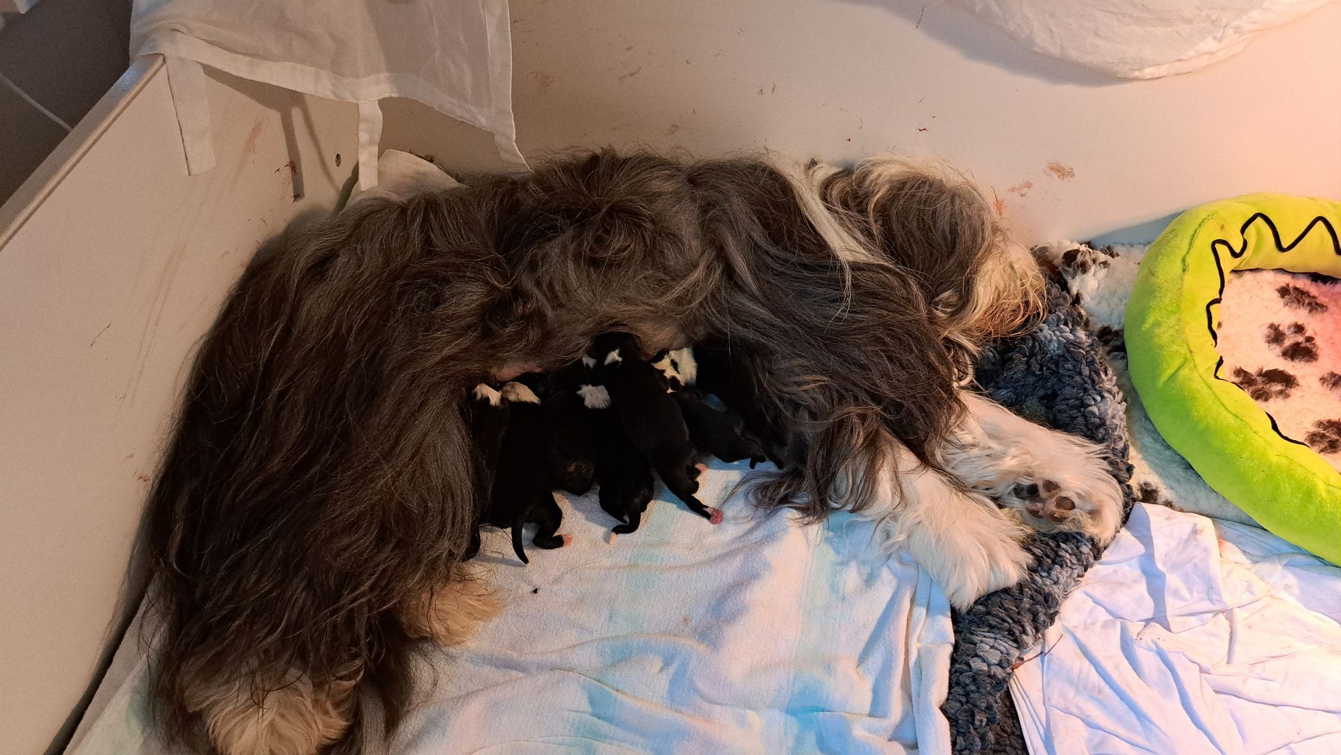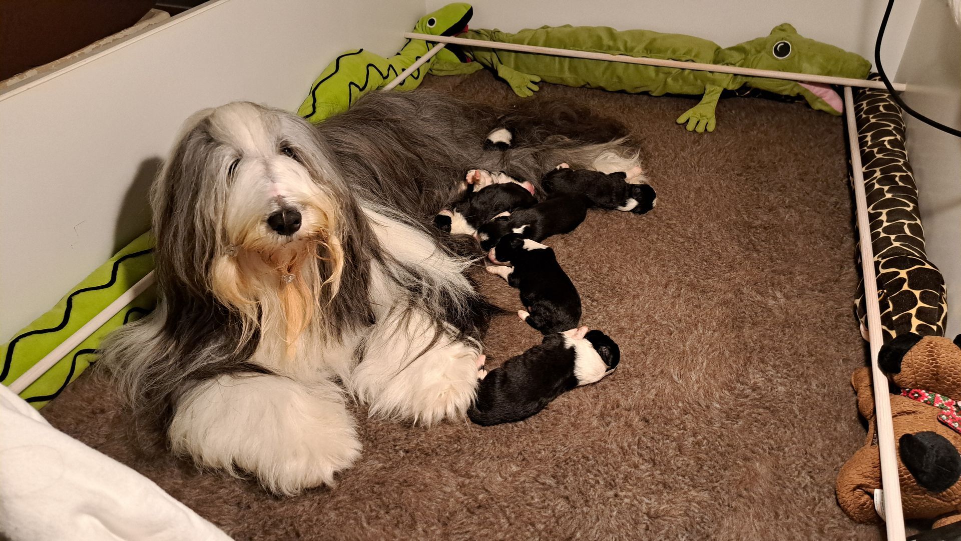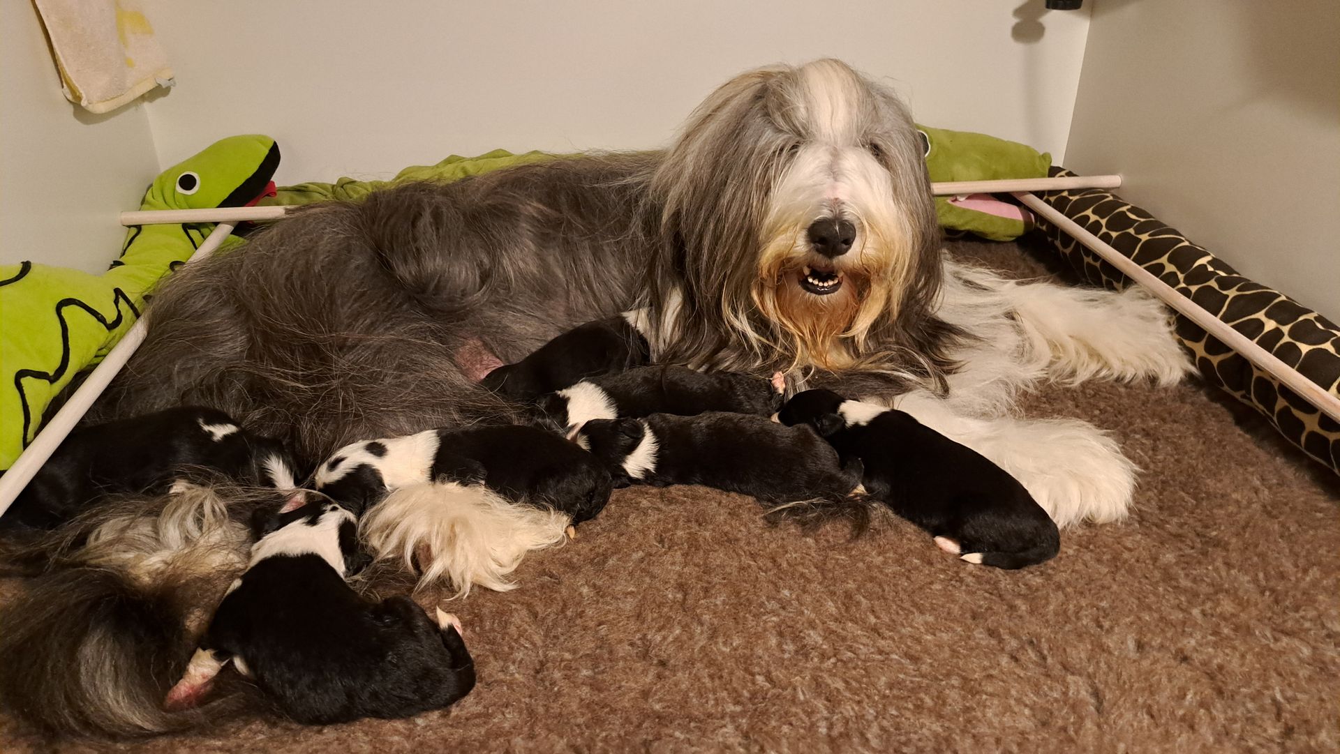 In dem größeren Welpengehege konnten wir die ersten Schritte zur Sauberkeit schonmal angehen, in dem die Beardiekinderchen ihr "Geschäft" in einem vorgegebenen Bereich erledigen.